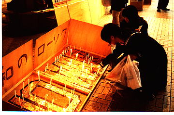 行動では新本勝庸・「地球村」高知代表が、人質解放を喜びながら「自分の国が軍隊に占領されたらどう思うか考えて欲しい。人質事件の原因である不法なイラク占領は解決していない。ロウソクを灯して平和の意思表示をして下さい」とハンドマイクで市民に呼びかけ。 親子連れや「戦争で人が死ぬのは嫌」と話す高校生など、市民が呼びかけに応えて足を止め、イラクでこれ以上の犠牲者が出ないように願いながら「NO・WAR」の文字を型どったロウソクに火を灯しました。