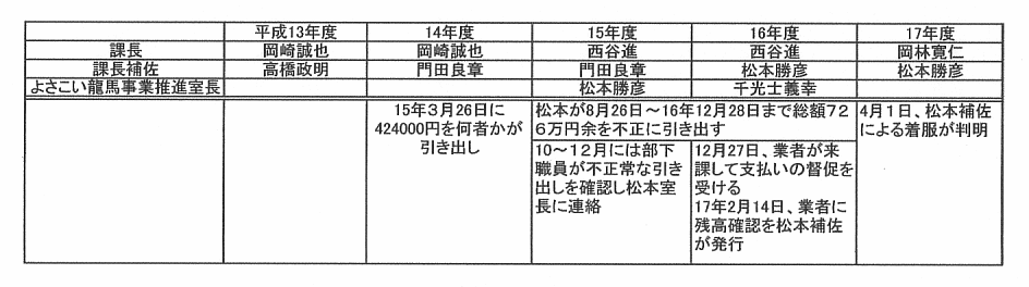 @松本課長補佐が「『龍馬脱藩・ゆかりの道』関連市町村協議会」の事業費の726万4933円を、平成15年8月26日から16年12月28日にわたり、借金返済等にあてるため14回不正に引き出していた事件。松本補佐は懲戒免職・逮捕。事件発覚後、本人から全額弁済されている。