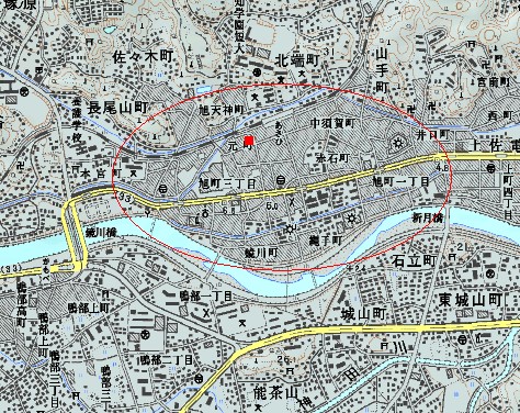 ■が日の出湯のあった場所 円内が影響が大きいと思われる地域