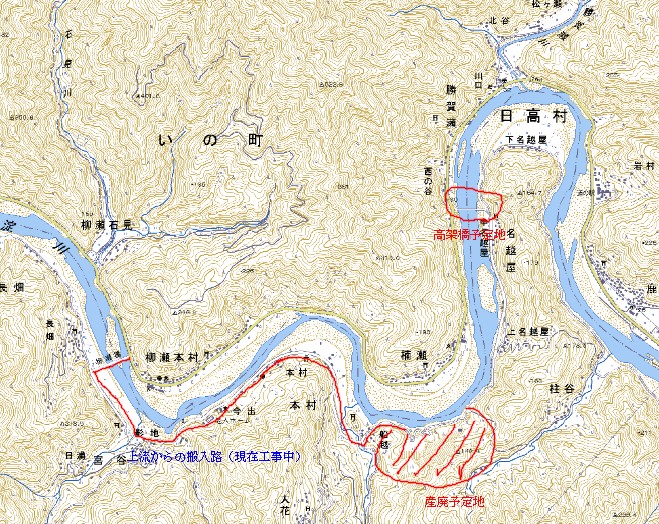 とりわけ突出しているのが廃棄物の搬入路の名目で17億円をかけてかけ替えが予定されている仁淀川にかかる高架橋(日高村名越屋といの町勝賀瀬の間にかかる。現在は沈下橋)です。