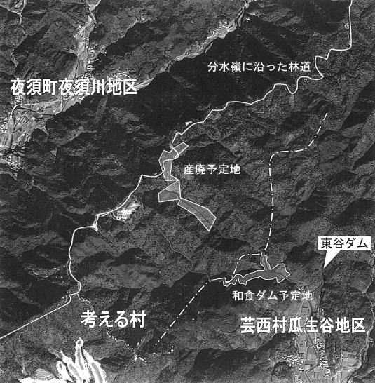 計画地は手結山から北東に伸びる稜線(羽尾方面への林道が走る)から東南(芸西側)にやや下った谷筋。地番は夜須町ですが和食川の源流域で、すぐ下流に芸西村瓜生野地区の集落や村の簡易水道の水源があります。また県が建設にとりかかっている和食ダムの貯水池のすぐ上流にあたります。過去にはサーキット場やゴルフ場計画が持ち上がり所有者が転々としてきたいわく付きの山です。
