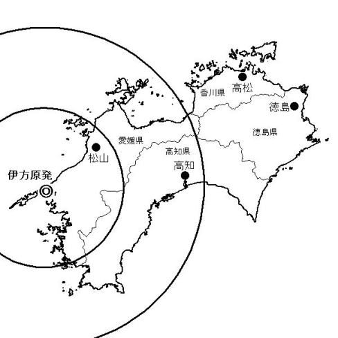 | 伊方原発事故に1シーベルト被曝することが予想されるエリア 外の円がMOX燃料、中の円がウラン燃料の場合 |