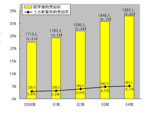 このような状況は小学校でも同様で、04年度では4604人、25・81%の受給率。4人に1人が受給しています。05年度の結果集計はまだ年度途中でありできていませんが、同教委学事課は「すでに昨年度分は超えている。さらに伸びることは確実」と話します。