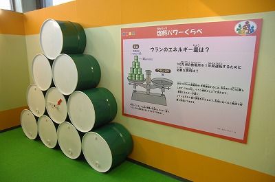 原子力発電の効率の高さを示す展示。矢印の部分の1グラムのウランでドラム缶10本と同等の発電ができるとしているが、ウラン精製や廃棄物処理に要するエネルギーは無視されている