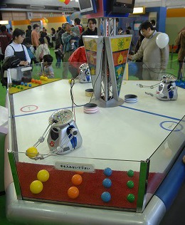 発電を模したボールをロボットでつかむゲーム つかみやすいように原発(黄色)が一番大きい