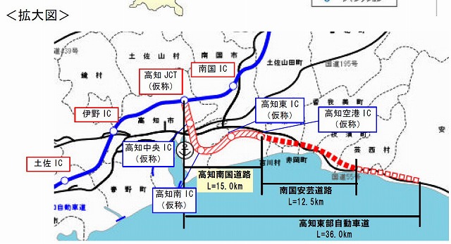 「高知南国道路」は高知自動車道高知ICから南下して五台山を貫通し、現国道(南国バイパス)と並行する高知空港までの15キロメートル。