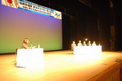 憲法記念日の5月3日、高知市の春野文化ホール「ピアステージ」で「憲法タウンミーティング」が開かれ、各政党の代表が発言者として参加し、憲法について討論しました。主催は社団法人・日本青年会議所高知ブロック協議会(上島潤代表)。