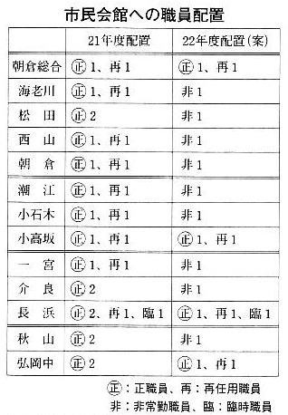 「部落差別がきびしく、隣保館活動が必要」であるならば、どの地区にも隣保事業を担う人員配置が必要なはず。朝倉総合、小高坂、長浜、弘岡中の4館だけを「差別」して正職員を配置することは、市の言う「部落差別のきびしさ」に軽重をつけるに等しく、市同和行政関係者からは「なぜこの4館なのか。理念なき撤退だ。隣保事業をすべて返上したほうが筋が通る」という批判が聞かれました。