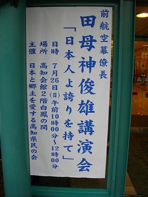 日本の侵略戦争を否定する論文を書き、航空自衛隊制服組のトップ・航空幕僚長を解任された田母神俊雄氏の講演を7月26日、聞く機会があった。300人ほど聴衆を集めた講演会のテーマは「日本人よ誇りを持て」。主催は「日本と郷土を愛する高知県民の会」という団体名になっていたが、実質的に取り仕切っていたのは高知県神社庁だった。