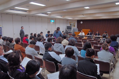 | 「子どもの近くで作ってこそ食育」と訴える母親(10月26日 夜須公民館) |