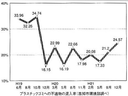 高知市が計画している家庭ゴミ収集の有料化にむけた説明会と軌を一にして、菖蒲谷プラスチック減容工場(※)に持ち込まれるプラスチックゴミの分別状況が悪化する数値が出ていることがこのほど分かりました。「有料化議論の中で、分別に協力しようという市民意識が低下しているのではないか」と市環境部など関係者に波紋を広げています。