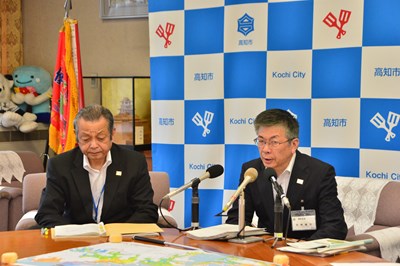 会見に臨む岡崎高知市長(右)