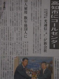 昨年9月7日の高知新聞夕刊1面に「高知市にコールセンター」と大見出しが踊りました。記事には岡崎誠也市長と光通信の青年幹部の握手写真、「情報通信サービス大手の光通信」、「電話や電子メールを通じた顧客対応の拠点となるコールセンター」、「50人雇用、数年後150人に」などと書かれていました。