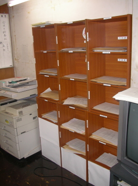 記者室には通称「投げ込み」と呼ばれる各社用のボックスが設置され、県がマスコミに発表したい時にはボックスに資料を配るだけで簡単に各社に伝達できるシステム。県関係では他に西庁舎3階に「教育記者室」、安芸総合庁舎、県警本部にも同様の記者室があります。